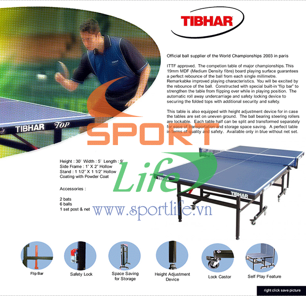 Bàn Tibhar Top đạt tiêu chuẩn ITTF được nhập khẩu nguyên chiếc từ Malaysia.