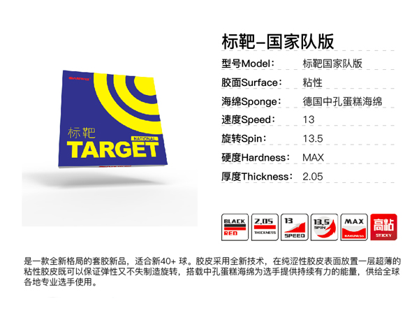 Sanwei đã làm rất tốt trong việc kết hợp topsheet tacky và sponge bọt khí. Cảm giác đầu tiên khi cầm Target National (TN) trên tay là vô cùng ấn tượng. Topsheet mịn màng, rất tacky. Sponge bọt khí màu xanh thời thượng tương tự những dòng flagship đến từ các thương hiệu nổi tiếng khác. Trọng lượng trung bình (khoảng 42->44g sau khi cắt). Từ bên ngoài, TN hoàn toàn không giống bất kì loại mút Tàu truyền thống nào khác.